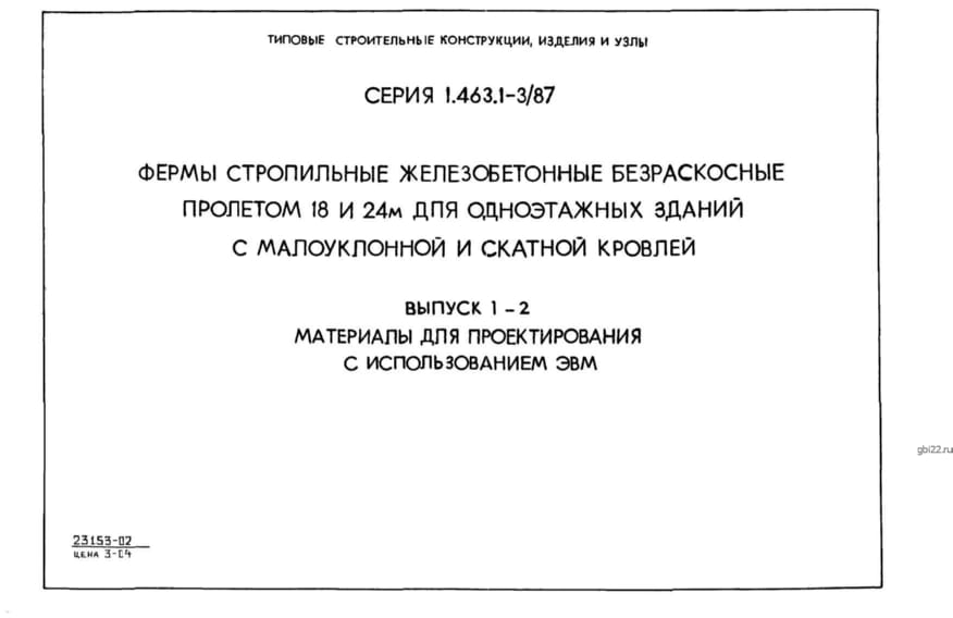| Название стандарта | Фермы стропильные железобетонные безраскосные пролетом 18 и 24 м для одноэтажных зданий с малоуклонной и скатной кровлей. |