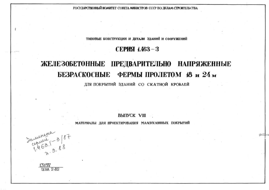 | Название стандарта | Железобетонные предварительно напряженные безраскосные фермы пролетом 18 и 24 м для покрытий зданий со скатной кровлей. |