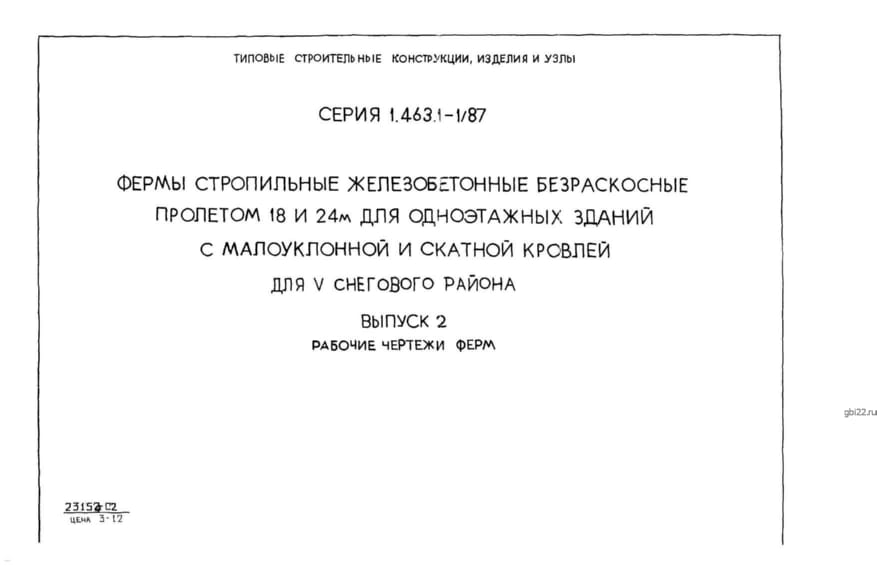 | Название стандарта | Фермы стропильные железобетонные безраскосные пролетом 18 и 24 м для одноэтажных зданий с малоуклонной и скатной кровлей для V снегового района. |