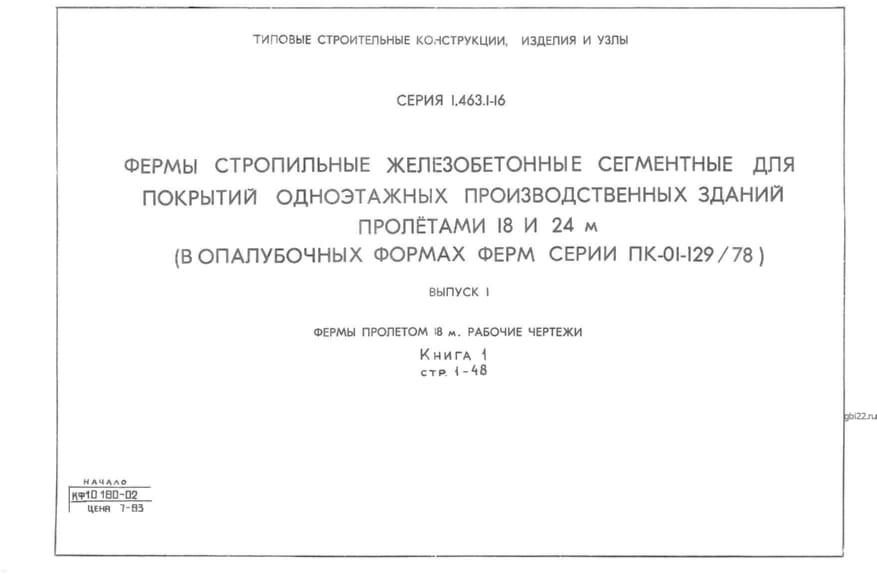 | Название стандарта | Фермы стропильные железобетонные сегментные для покрытий одноэтажных производственных зданий пролетами 18 и 24 м (в опалубочных формах ферм серии ПК-01-129/78). |