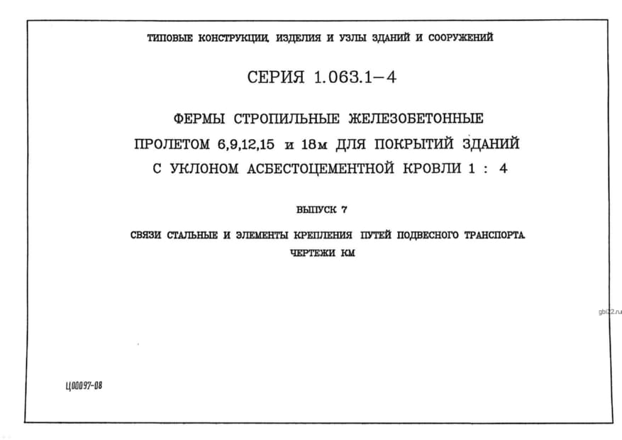 | Название стандарта | Фермы стропильные железобетонные пролетом 6; 9; 12; 15 и 18 м для покрытий зданий с уклоном асбестоцементной кровли 1:4. |