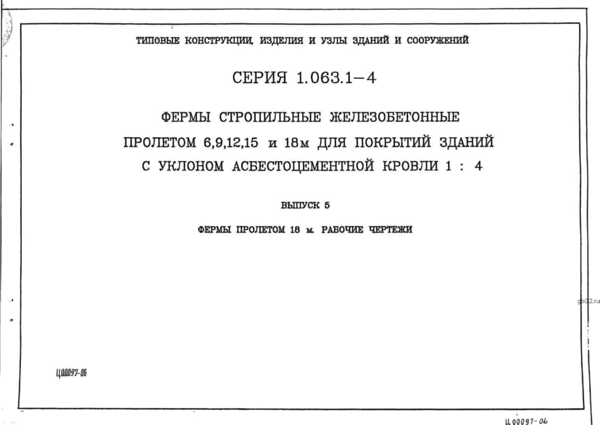 | Название стандарта | Фермы стропильные железобетонные пролетом 6; 9; 12; 15 и 18 м для покрытий зданий с уклоном асбестоцементной кровли 1:4. |