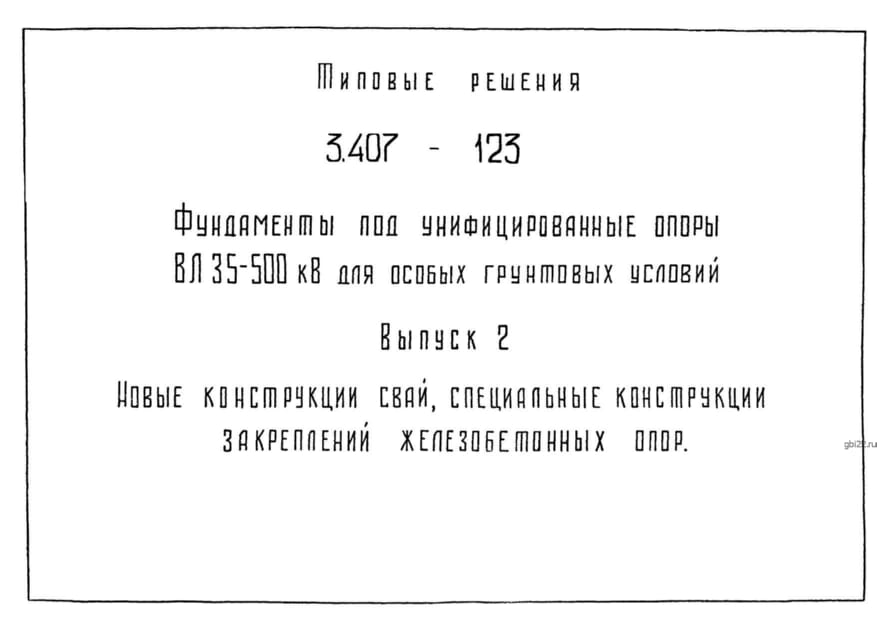 | Название стандарта | Фундаменты под унифицированные опоры ВЛ 35 - 500 кВ для особых грунтовых условий. |