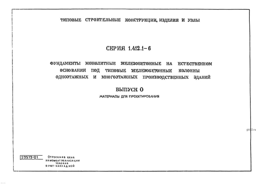 | Название стандарта | Фундаменты монолитные железобетонные на естественном основании под типовые железобетонные колонны одноэтажных и многоэтажных производственных зданий. |