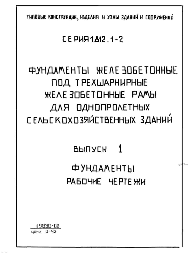 | Название стандарта | Фундаменты железобетонные под трехшарнирные железобетонные рамы для однопролетных сельскохозяйственных зданий. |