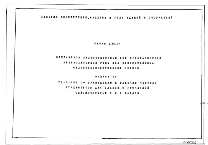 | Название стандарта | Фундаменты железобетонные под трехшарнирные железобетонные рамы для однопролетных сельскохозяйственных зданий. |