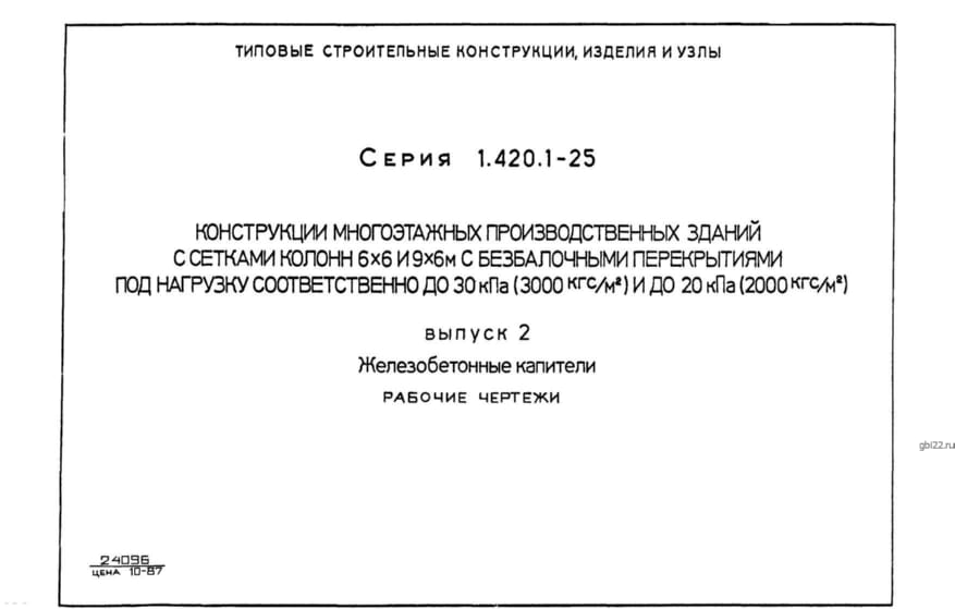 | Название стандарта | Конструкции многоэтажных производственных зданий с сетками колонн 6х6 и 9х6 м с безбалочными перекрытиями под нагрузку соответственно до 30 кПа (3000 кгс/кв.м) и до 20 кПа (2000 кгс/кв.м). |