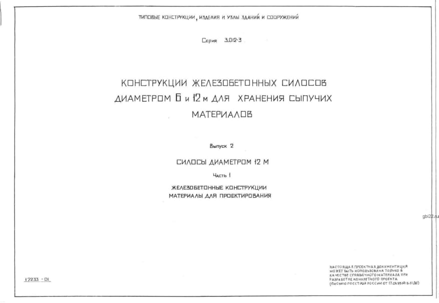 | Название стандарта | Конструкции железобетонных силосов диаметром 6 и 12 м для хранения сыпучих материалов. |