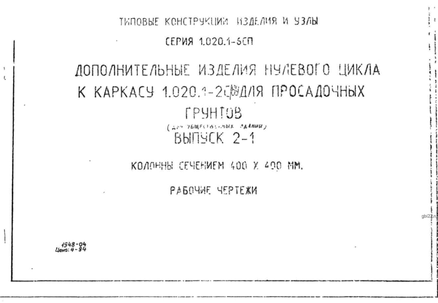 | Название стандарта | Дополнительные изделия нулевого цикла к каркасу 1.020.1-2с/89 для просадочных грунтов (для общественных зданий). |