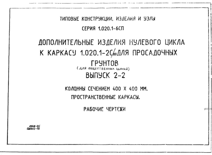 | Название стандарта | Дополнительные изделия нулевого цикла к каркасу 1.020.1-2с/89 для просадочных грунтов (для общественных зданий). |