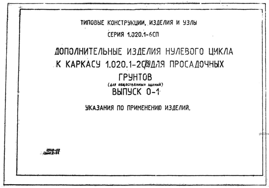 | Название стандарта | Дополнительные изделия нулевого цикла к каркасу 1.020.1-2с/89 для просадочных грунтов (для общественных зданий). |
