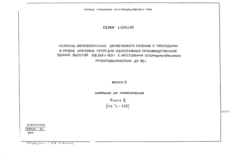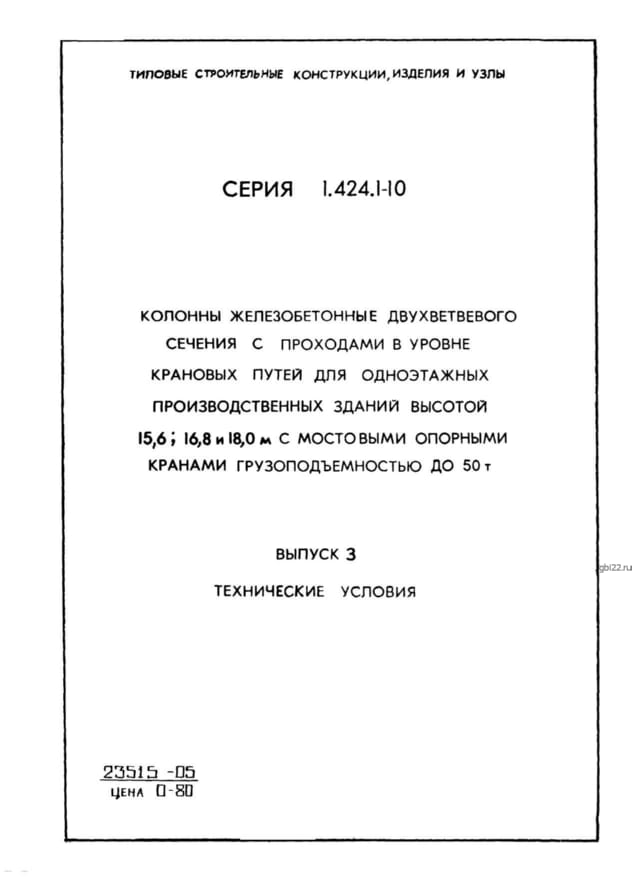 | Название стандарта | Колонны железобетонные двухветвевого сечения с проходами в уровне крановых путей для одноэтажных производственных зданий высотой 15,6; 16,8 и 18,0 м с мостовыми опорными кранами грузоподъемностью до 50 т. |