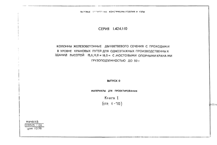 | Название стандарта | Колонны железобетонные двухветвевого сечения с проходами в уровне крановых путей для одноэтажных производственных зданий высотой 15,6; 16,8 и 18,0 м с мостовыми опорными кранами грузоподъемностью до 50 т. |
