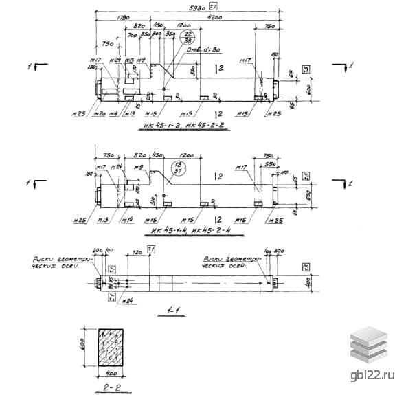 Колонны ИК 45-2-2 размеры: длина, мм.: 5980, ширина, мм.: 600, высота, мм.: 400, вес, кг.: 3800, марка бетона: . Изделия относятся к категории Колонны железобетонные-Колонны и изготавливаются по технической документации согласно серия ИИ 22-3/70