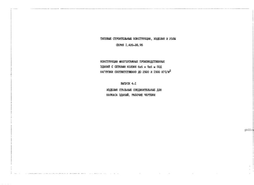 | Название стандарта | Конструкции многоэтажных производственных зданий с сетками колонн 6х6 и 9х6 м под нагрузки соответственно до 2500 и 1500 кгс/м2. |