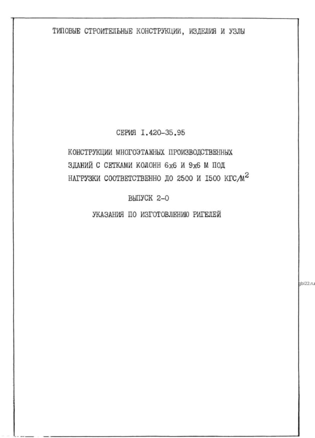 | Название стандарта | Конструкции многоэтажных производственных зданий с сетками колонн 6х6 и 9х6 м под нагрузки соответственно до 2500 и 1500 кгс/м2. |