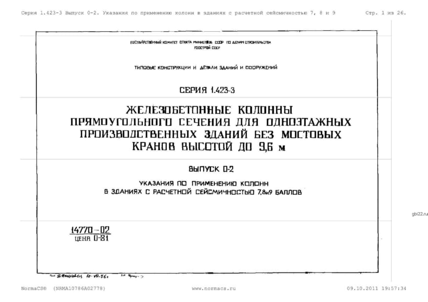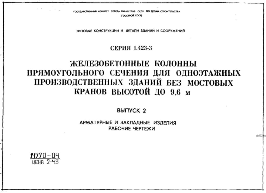 | Название стандарта | Железобетонные колонны прямоугольного сечения для одноэтажных производственных зданий без мостовых кранов высотой до 9,6 м. |