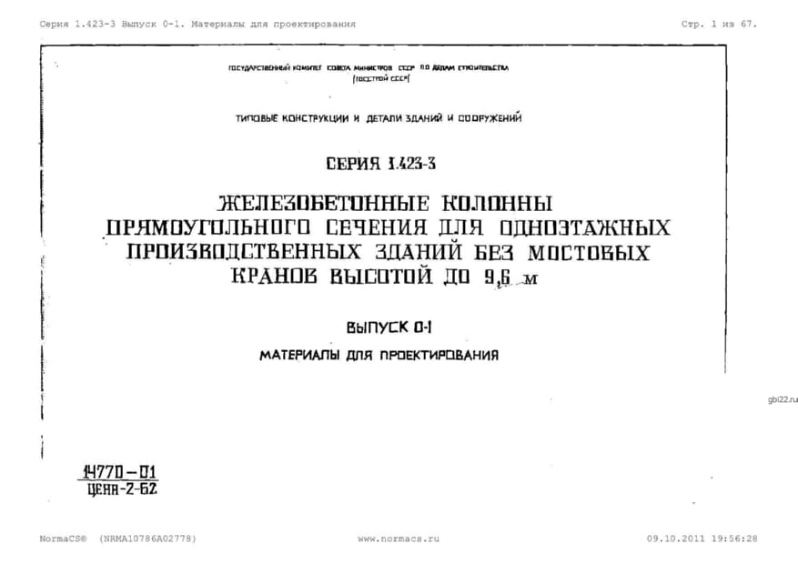 | Название стандарта | Железобетонные колонны прямоугольного сечения для одноэтажных производственных зданий без мостовых кранов высотой до 9,6 м. |