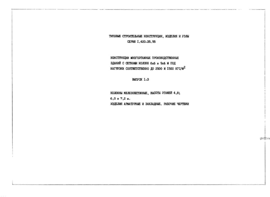 | Название стандарта | Конструкции многоэтажных производственных зданий с сетками колонн 6х6 и 9х6 м под нагрузки соответственно до 2500 и 1500 кгс/м2. |