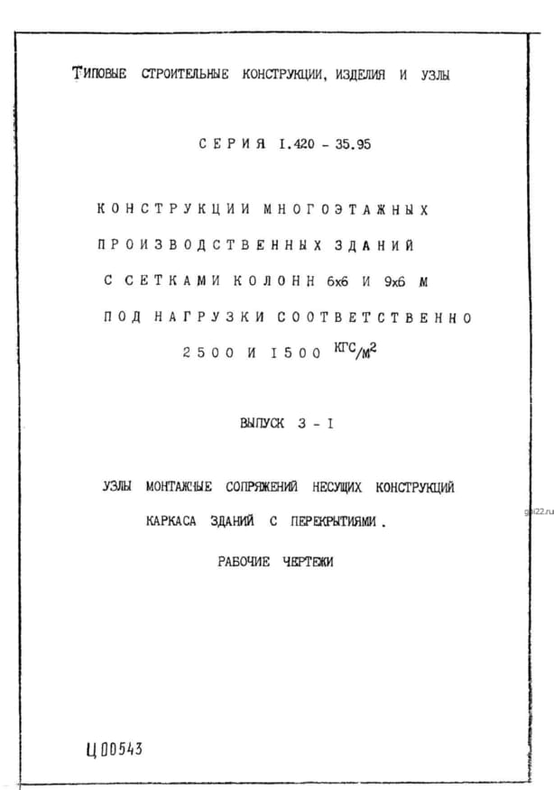 | Название стандарта | Конструкции многоэтажных производственных зданий с сетками колонн 6х6 и 9х6 м под нагрузки соответственно до 2500 и 1500 кгс/м2. |