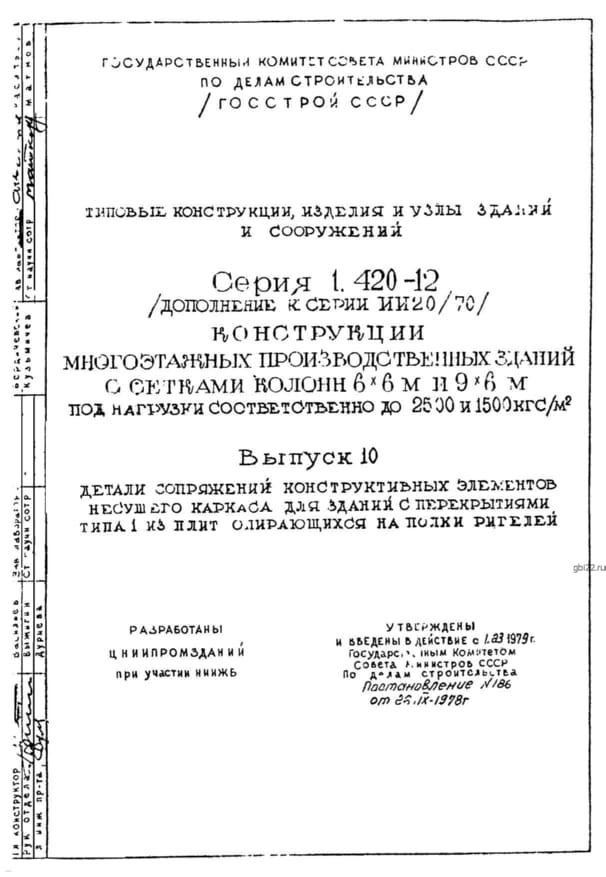 | Название стандарта | Конструкции многоэтажных производственных зданий с сетками колонн 6х6 и 9х6 м под нагрузки соответственно до 2500 и 1500 кгс/кв. м. |