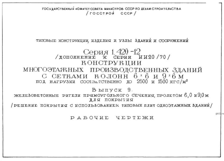 | Название стандарта | Конструкции многоэтажных производственных зданий с сетками колонн 6х6 и 9х6 м под нагрузки соответственно до 2500 и 1500 кгс/кв. м. |