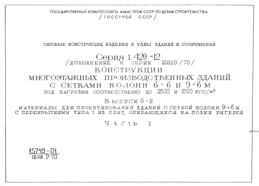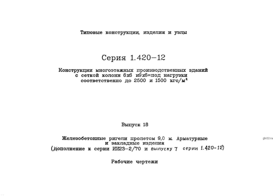 | Название стандарта | Конструкции многоэтажных производственных зданий с сетками колонн 6х6 и 9х6 м под нагрузки соответственно до 2500 и 1500 кгс/кв. м. |