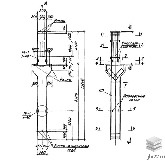 | Название стандарта | Колонны железобетонные прямоугольного сечения с проходами в уровне крановых путей для одноэтажных производственных зданий высотой 10,8-14,4 м, оборудованных мостовыми опорными кранами грузоподъемностью до 32 т. |