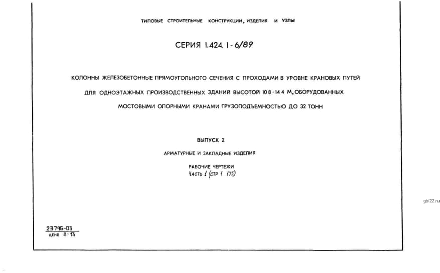 | Название стандарта | Колонны железобетонные прямоугольного сечения с проходами в уровне крановых путей для одноэтажных производственных зданий высотой 10,8-14,4 м, оборудованных мостовыми опорными кранами грузоподъемностью до 32 т. |