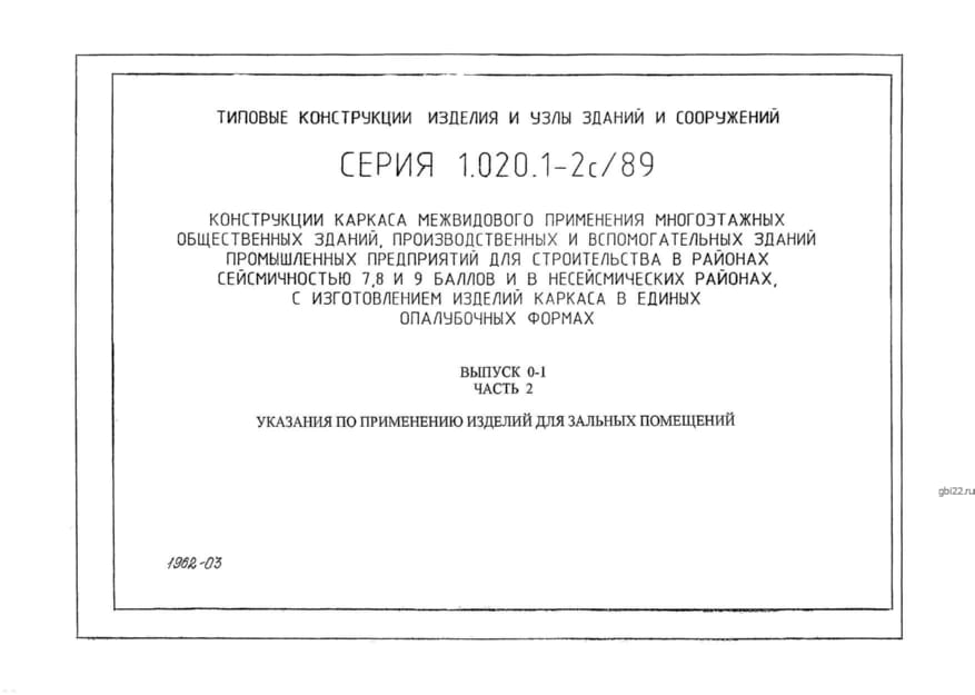 | Название стандарта | Конструкции каркаса межвидового применения многоэтажных общественных зданий, производственных и вспомогательных зданий промышленных предприятий для строительства в районах сейсмичностью 7, 8, 9 баллов и в несейсмических районах с изготовлением изделий кар |