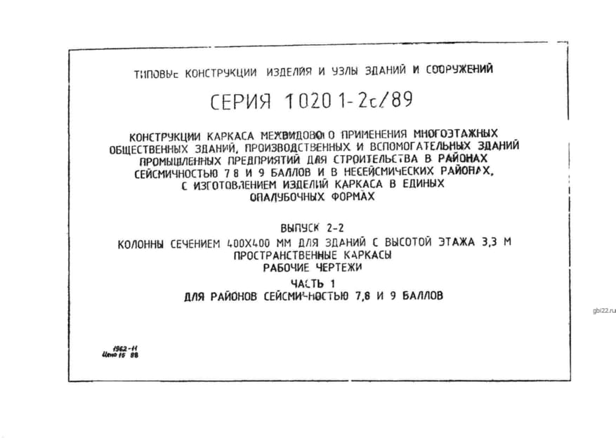 | Название стандарта | Конструкции каркаса межвидового применения многоэтажных общественных зданий, производственных и вспомогательных зданий промышленных предприятий для строительства в районах сейсмичностью 7, 8, 9 баллов и в несейсмических районах с изготовлением изделий кар |