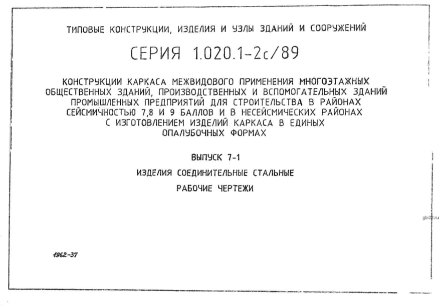 | Название стандарта | Конструкции каркаса межвидового применения многоэтажных общественных зданий, производственных и вспомогательных зданий промышленных предприятий для строительства в районах сейсмичностью 7, 8, 9 баллов и в несейсмических районах с изготовлением изделий кар |