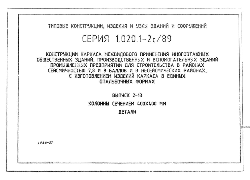 | Название стандарта | Конструкции каркаса межвидового применения многоэтажных общественных зданий, производственных и вспомогательных зданий промышленных предприятий для строительства в районах сейсмичностью 7, 8, 9 баллов и в несейсмических районах с изготовлением изделий кар |