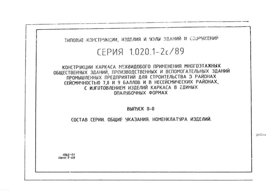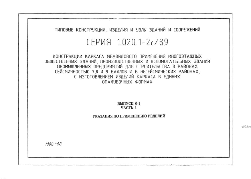 | Название стандарта | Конструкции каркаса межвидового применения многоэтажных общественных зданий, производственных и вспомогательных зданий промышленных предприятий для строительства в районах сейсмичностью 7, 8, 9 баллов и в несейсмических районах с изготовлением изделий кар |