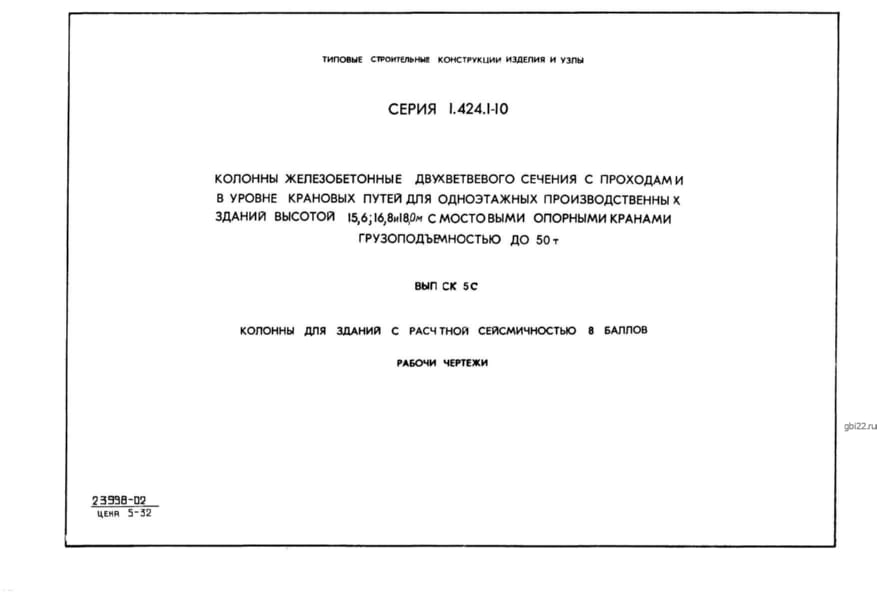 | Название стандарта | Колонны железобетонные двухветвевого сечения с проходами в уровне крановых путей для одноэтажных производственных зданий высотой 15,6; 16,8 и 18,0 м с мостовыми опорными кранами грузоподъемностью до 50 т. |