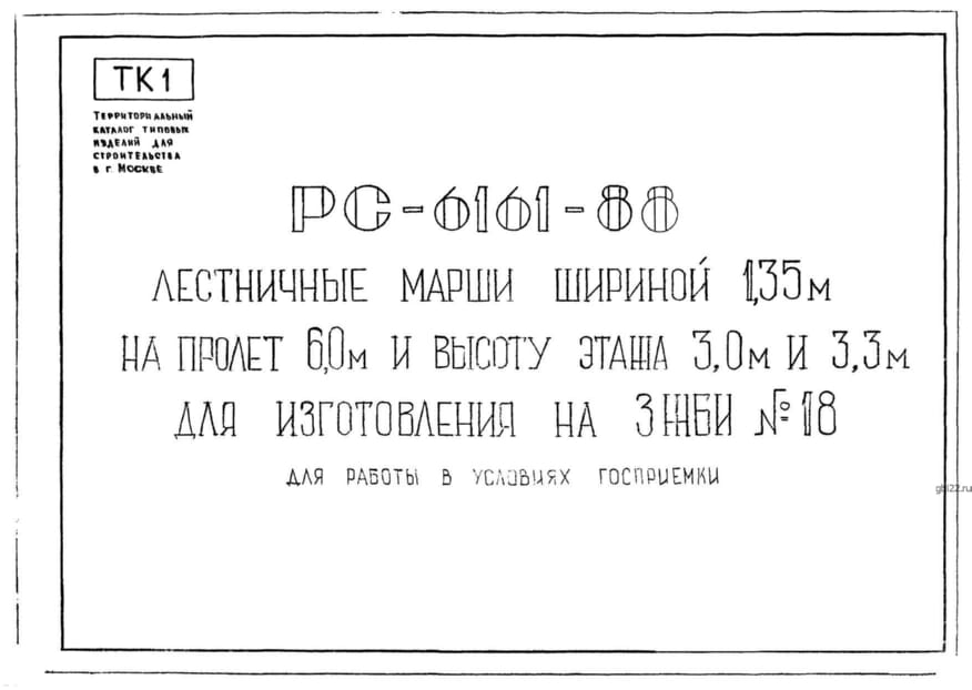 | Название стандарта | Лестничные марши шириной 1,35 м на пролет 6,0 м и высоту этажа 3,0 м и 3,3 м для изготовления на ЗЖБИ № 18 для работы в условиях госприемки. |