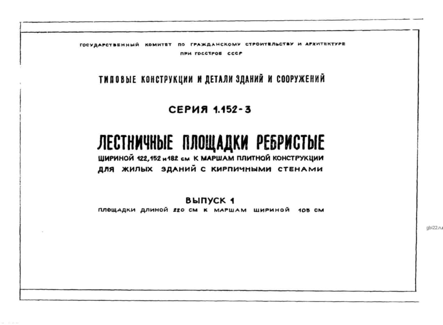 | Название стандарта | Лестничные площадки ребристые шириной 122, 152 и 182 см к маршам плитной конструкции для жилых зданий с кирпичными стенами. |