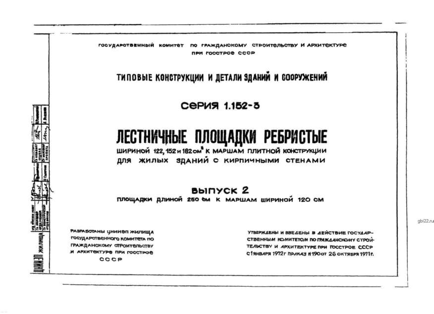 | Название стандарта | Лестничные площадки ребристые шириной 122, 152 и 182 см к маршам плитной конструкции для жилых зданий с кирпичными стенами. |