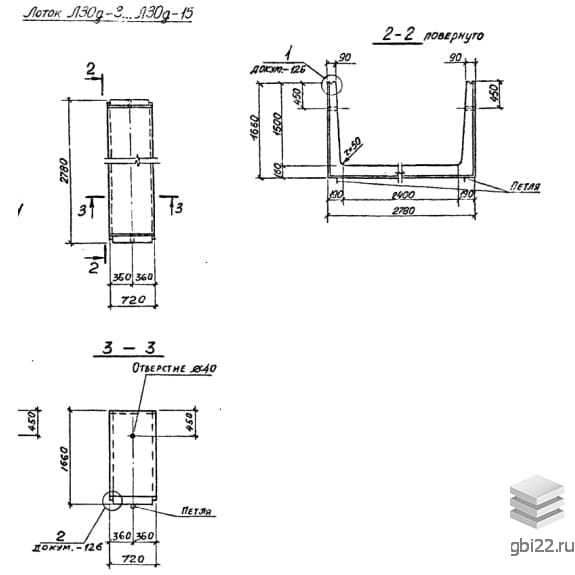 Лотки Л 30д-12 размеры: длина, мм.: 720, ширина, мм.: 2780, высота, мм.: 1660, вес, кг.: 1630, марка бетона: М400. Изделия относятся к категории Лотковые элементы-Лотки теплотрасс и изготавливаются по технической документации согласно серия 3.006.1-2/82