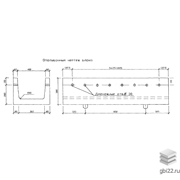 Лотки БЛ 0.3 представляют собой П-образные железобетонные конструкции с усиленными стенками. Отличительные черты: