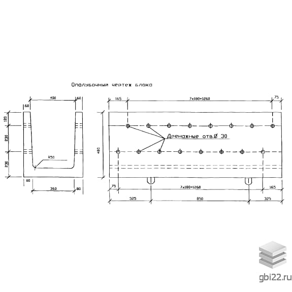 Лотки БЛ 0.5 – прямоугольные П-образные конструкции из гидротехнического бетона. Оснащены дренажными отверстиями диаметром 30 мм и закруглённым дном (радиус 50 мм).
