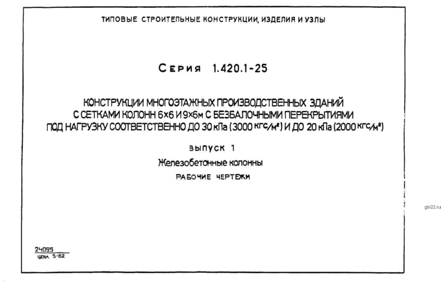 | Название стандарта | Конструкции многоэтажных производственных зданий с сетками колонн 6х6 и 9х6 м с безбалочными перекрытиями под нагрузку соответственно до 30 кПа (3000 кгс/кв.м) и до 20 кПа (2000 кгс/кв.м). |
