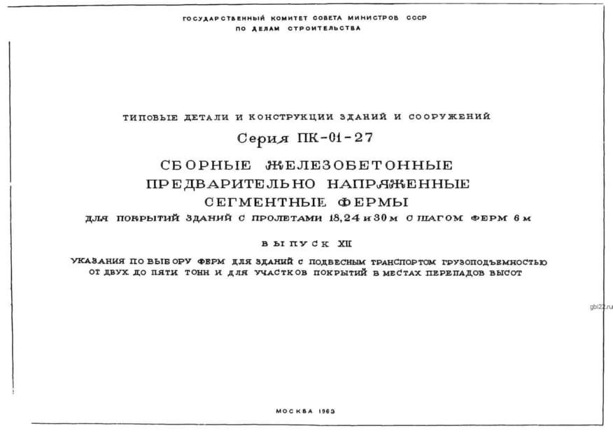 | Название стандарта | Сборные железобетонные предварительно напряженные сегментные фермы для покрытия зданий с пролетами 18, 24 и 30 м с шагом ферм 6,0 м. |