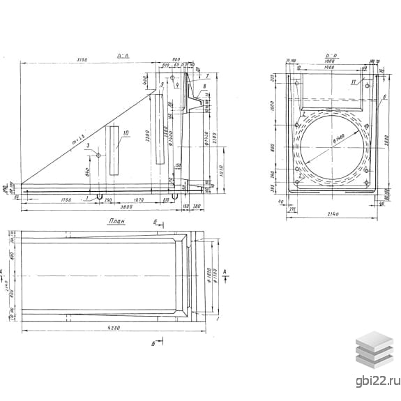 Оголовки с ныряющими стенками ОН 14 размеры: длина, мм.: 4230, ширина, мм.: 2140, высота, мм.: 2760, вес, кг.: 9460, марка бетона: М200. Изделия относятся к категории Портальные стенки-Оголовки с ныряющими стенками и изготавливаются по технической документации согласно серия 3.820-6