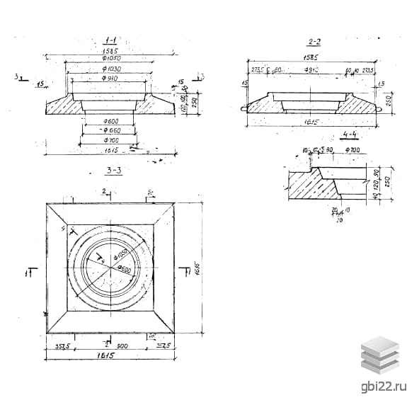Опорная плита ОП 1к – это железобетонное основание усеченно-пирамидальной формы с центральным отверстием. Нижний диаметр соответствует горловине колодца, верхний – размеру чугунного люка. Изделие служит верхней опорой для водосточных систем и монтируется совместно с кольцами по Альбому ПС-334.
