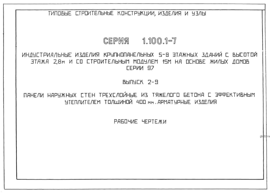 | Название стандарта | Индустриальные изделия крупнопанельных 5 – 9 этажных зданий с высотой этажа 2,8 м и со строительным модулем 15 м на основе жилых домов серии 97. Выпуск 0. Состав серии. Материалы для проектирования. |