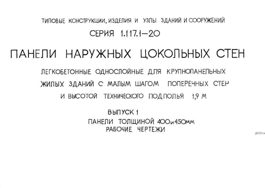 | Название стандарта | Панели наружных цокольных стен легкобетонные однослойные для крупнопанельных жилых зданий с малым шагом поперечных стен и высотой технического подполья 1,9 м. |