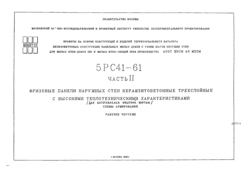 | Название стандарта | Проекты на основе конструкций и изделий территориального каталога. Железобетонные конструкции панельных жилых домов с узким шагом несущих стен для жилых блок-домов П55 и жилых блок-секций П55М производства АООТ БКСМ АО МПСМ. Часть II. Фризовые панели нару |