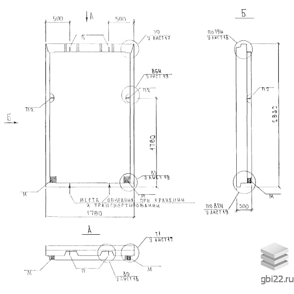 Подъем осуществляется только за строповочные петли с использованием балансирующих траверс. Хранение - вертикально в кассетах с деревянными прокладками, расположенными под петлями.
