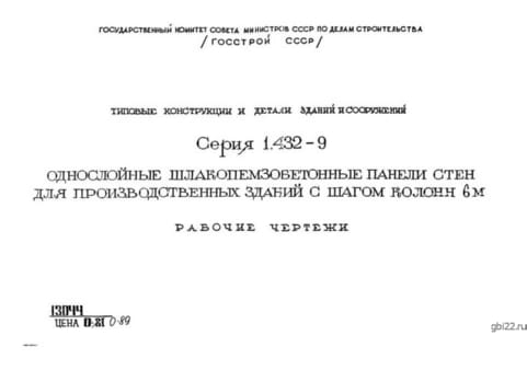 | Название стандарта | Однослойные шлакопемзобетонные панели стен для производственных зданий с шагом колонн 6 м. Рабочие чертежи. |